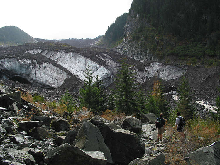 Brian and Rick look up at glacier's snout. This is at 3600'/1100m elevation or so. It's kind of strange to see a glacier this low--yeah, in Alaska they come right down to sea level, but this isn't Alaska!