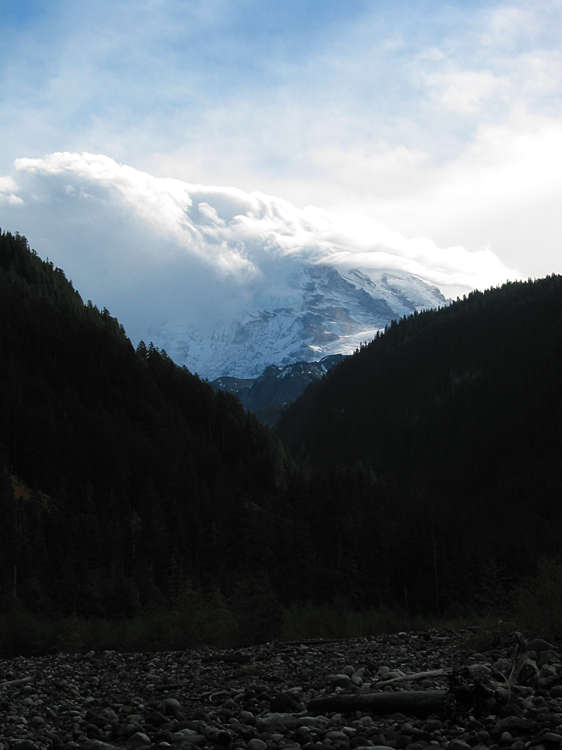 We finally saw a little bit of Mt Rainier. Notice the clouds 'backing up' on the right slope.