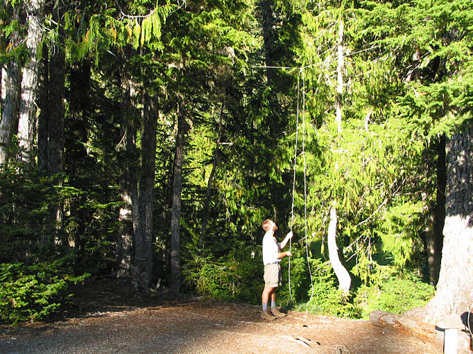 Brian plays with the bear wire. This is a steel wire, with a pulley at top, where you can clip your food so the black bears don't get at it.